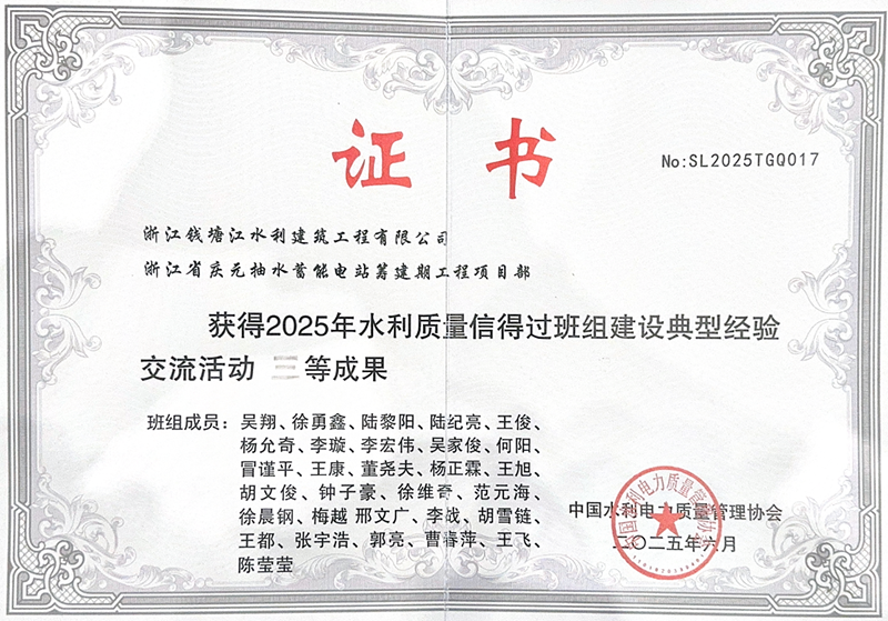 近日,中國水利電力質(zhì)量管理協(xié)會公布2025年度水利質(zhì)量信得過班組建設(shè)典型經(jīng)驗交流活動評選結(jié)果,慶元抽蓄籌建期EPC總承包項目憑借扎實有效的質(zhì)量管理實踐和突出的建設(shè)成果,榮獲“2025年水利質(zhì)量信得過班組建設(shè)典型經(jīng)驗交流活動”三等成果。這一榮譽不僅為“浙錢水建”品牌再添光彩,更標志著公司在工程質(zhì)量管理領(lǐng)域獲得了行業(yè)權(quán)威機構(gòu)的高度認可。